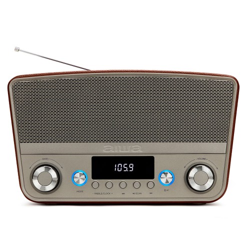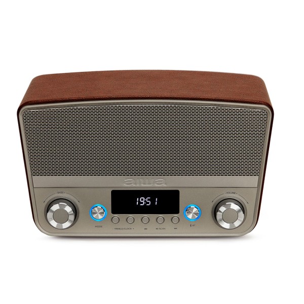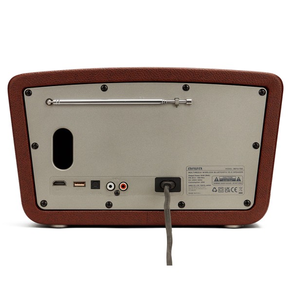 Altavoz multimedia de 50W RMS, Vintage con Bluetooth, entrada óptica, auxiliar, HDMI ARC y USB-MP3, con radio FM y reloj.
