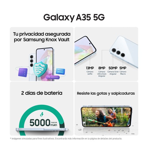 Libera el potencial del procesador Octa-core con GPU y NPU mejoradas, creado para jugar, trabajar en multitarea y ver contenido con total fluidez. Galaxy A35 5G incluye una cámara de vapor de gran tamaño para refrigerar el sistema y poder realizar tareas exigentes. El almacenamiento interno de 128 GB o 256 GB incluye una ranura microSD para una tarjeta de hasta 1 TB.