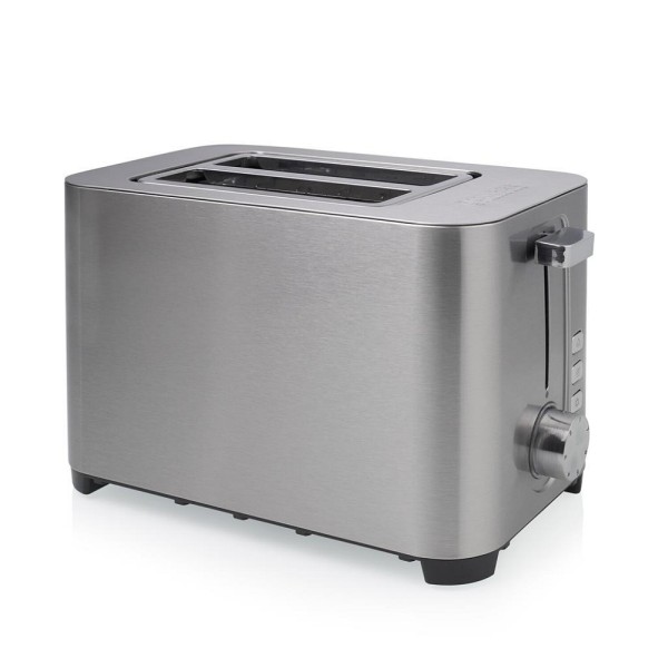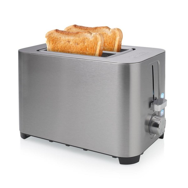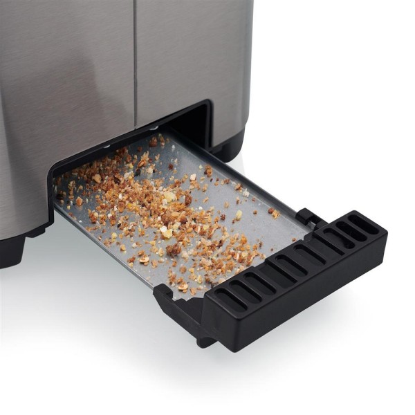 Esta tostadora tiene un tamaño compacto, por lo que puede tostar dos rebanadas pequeñas al mismo tiempo. Es el electrodoméstico perfecto para preparar un desayuno rápido o calentar panecillos en el accesorio incluido.