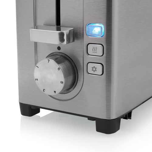 Este modelo incluye una ruedecilla en la parte delantera que sirve para elegir el nivel de tostado. Además, permite descongelar alimentos y recalentar panecillos en el accesorio independiente. ¿Está tostando demasiado rápido? Utilice la función de cancelar y detenga el proceso.