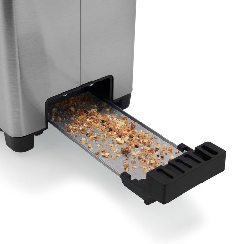 Además de tener un buen tamaño, la tostadora de Princess viene con un práctico sistema de guardado del cable y una bandeja extraíble para migas que evita que queden restos de pan en el armario o la encimera.