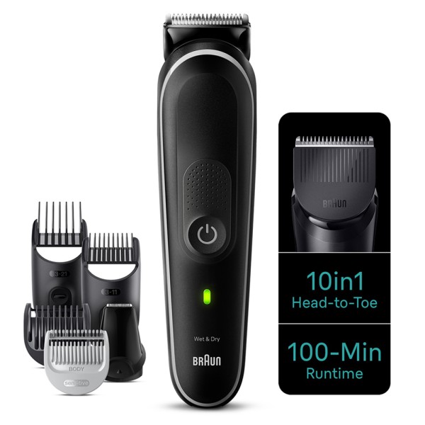 Kit de cuidado 10 en 1 diseñado para el cuidado de la barba, el cabello, la cara y el cuerpo. Con cuchillas ultraafiladas, peine sensible y autonomía de 100 minutos.