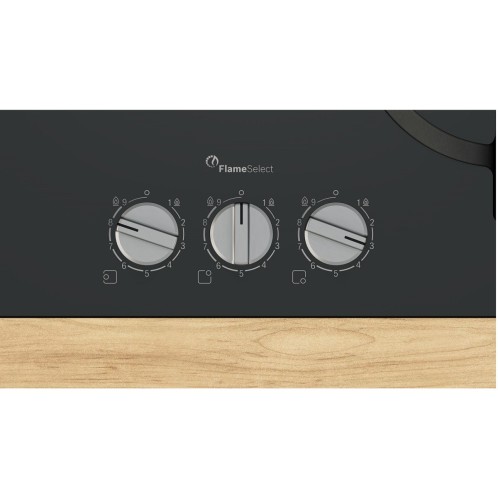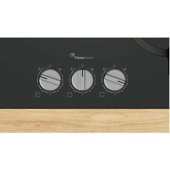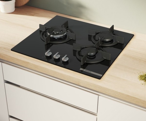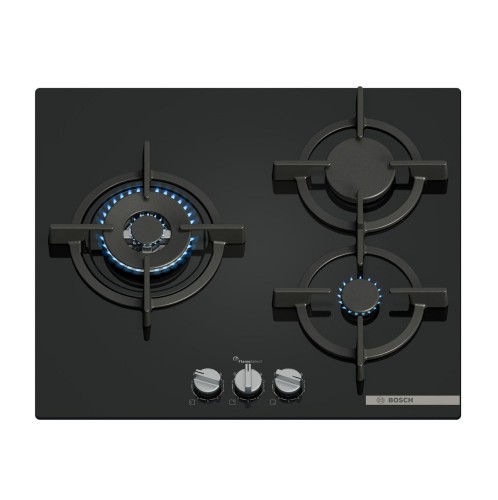 Placa de gas Bosch, vidrio templado, 60 cm de ancho. FlameSelect: regulación con 9 niveles. 3 quemadores. Mandos metálicos. Preparada para gas natural. Inyectores opcionales para gas butano incluidos.