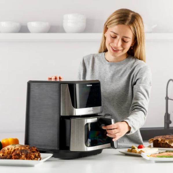Con una capacidad de 8 litros, esta freidora de aire utiliza la tecnología 360 Heat Technology para cocinar los alimentos de manera uniforme y sin necesidad de añadir aceite.